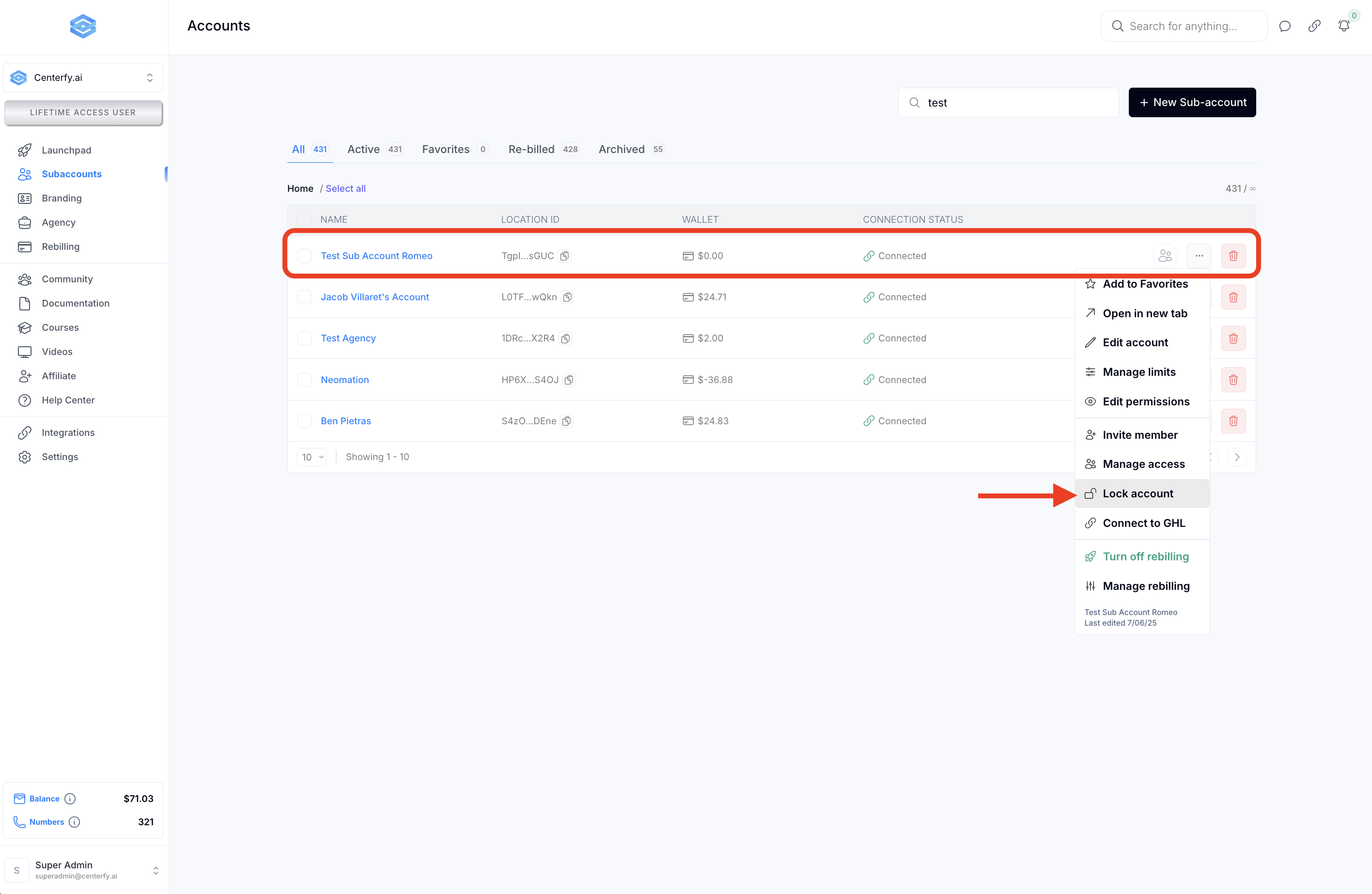 1.2 Locate the Subaccount you want to restrict and click “Lock Account”