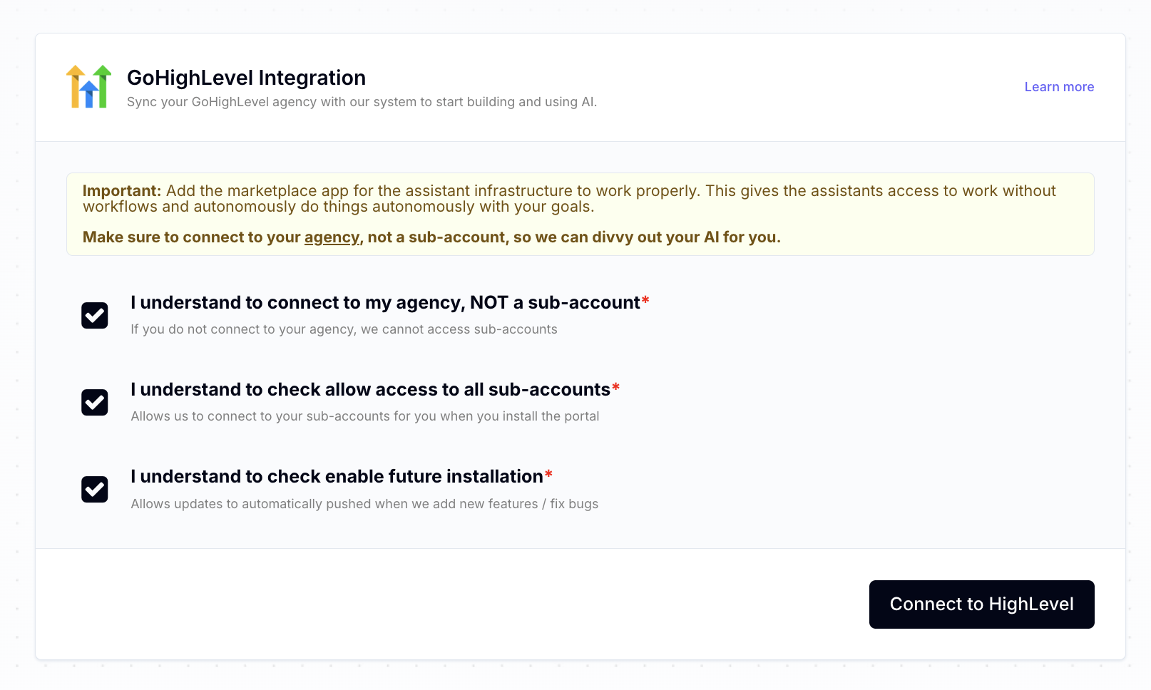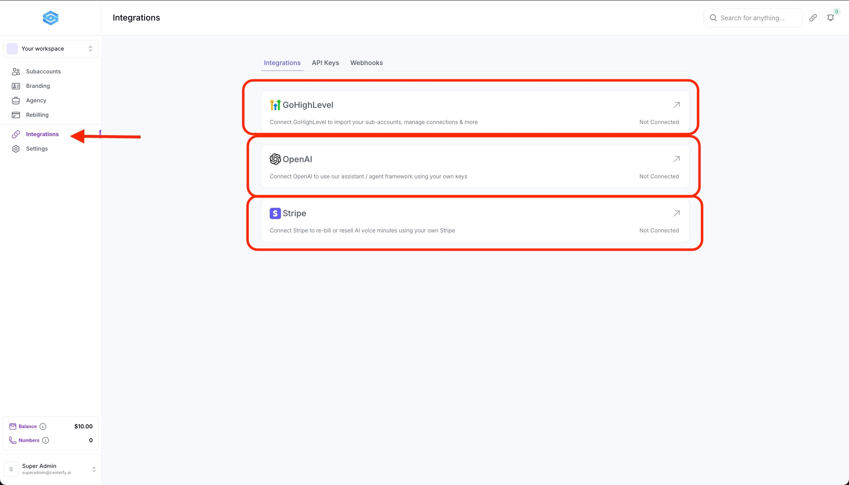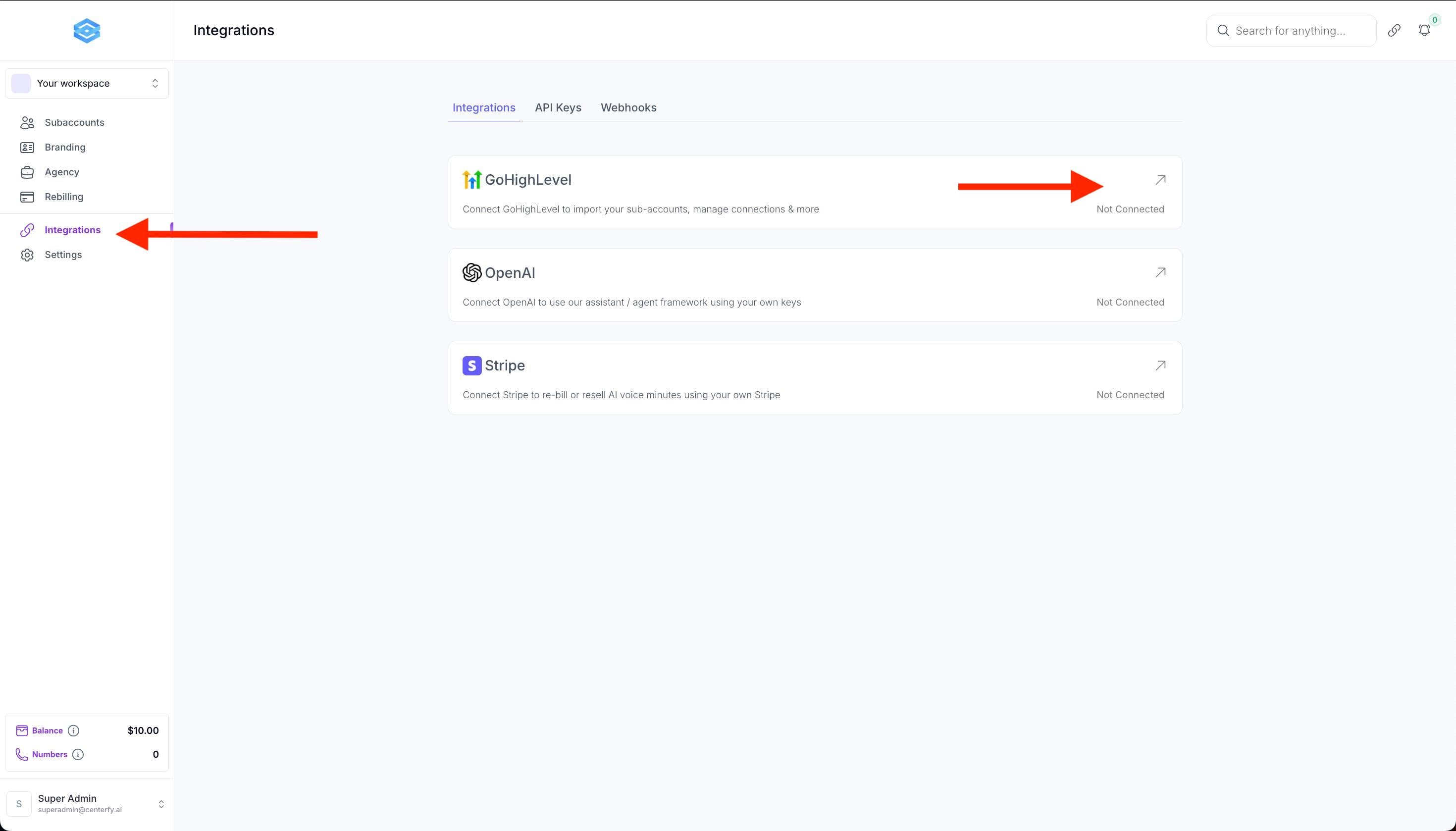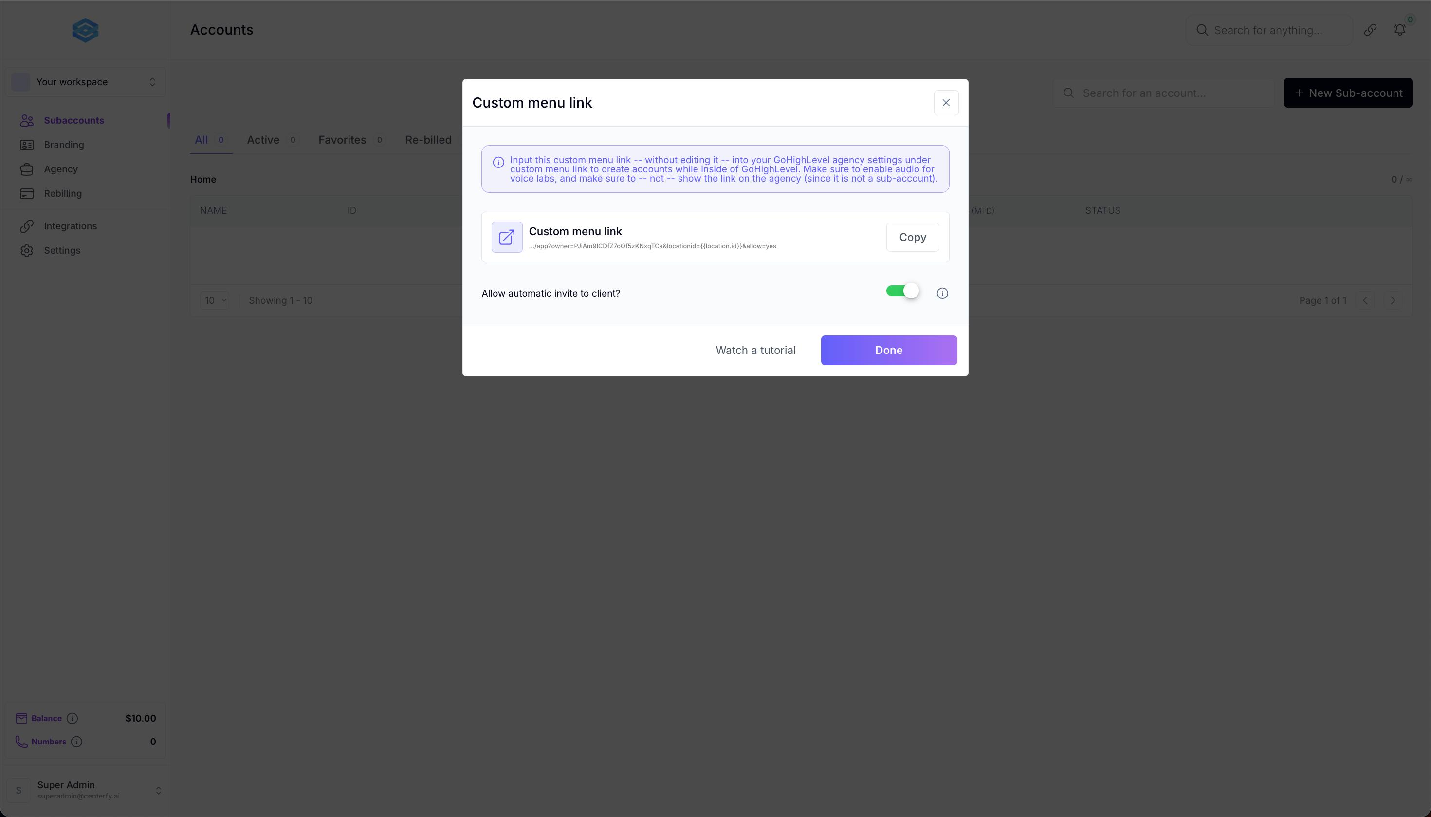 *Important: Ensure to enable auto rebilling for your API. If your balance falls into negative your AI Agents for your entire Agency workspace will not work.