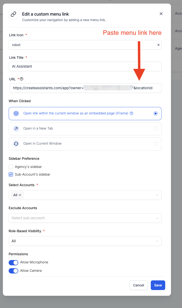 2.4 Paste the menu link you copied in step 2.2