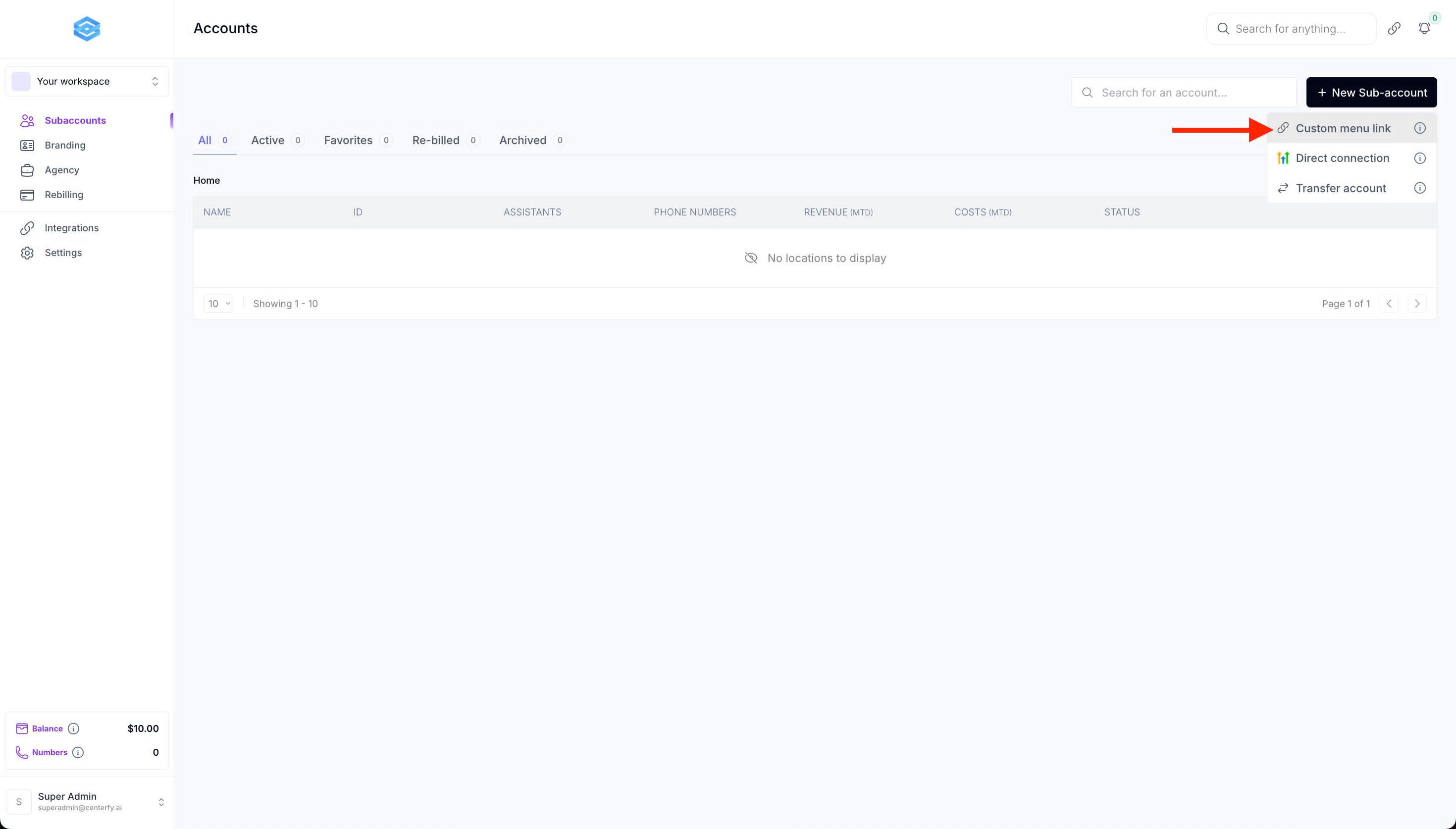Go to Subaccounts then click on "+New Sub-account" then Custom Menu Link.
