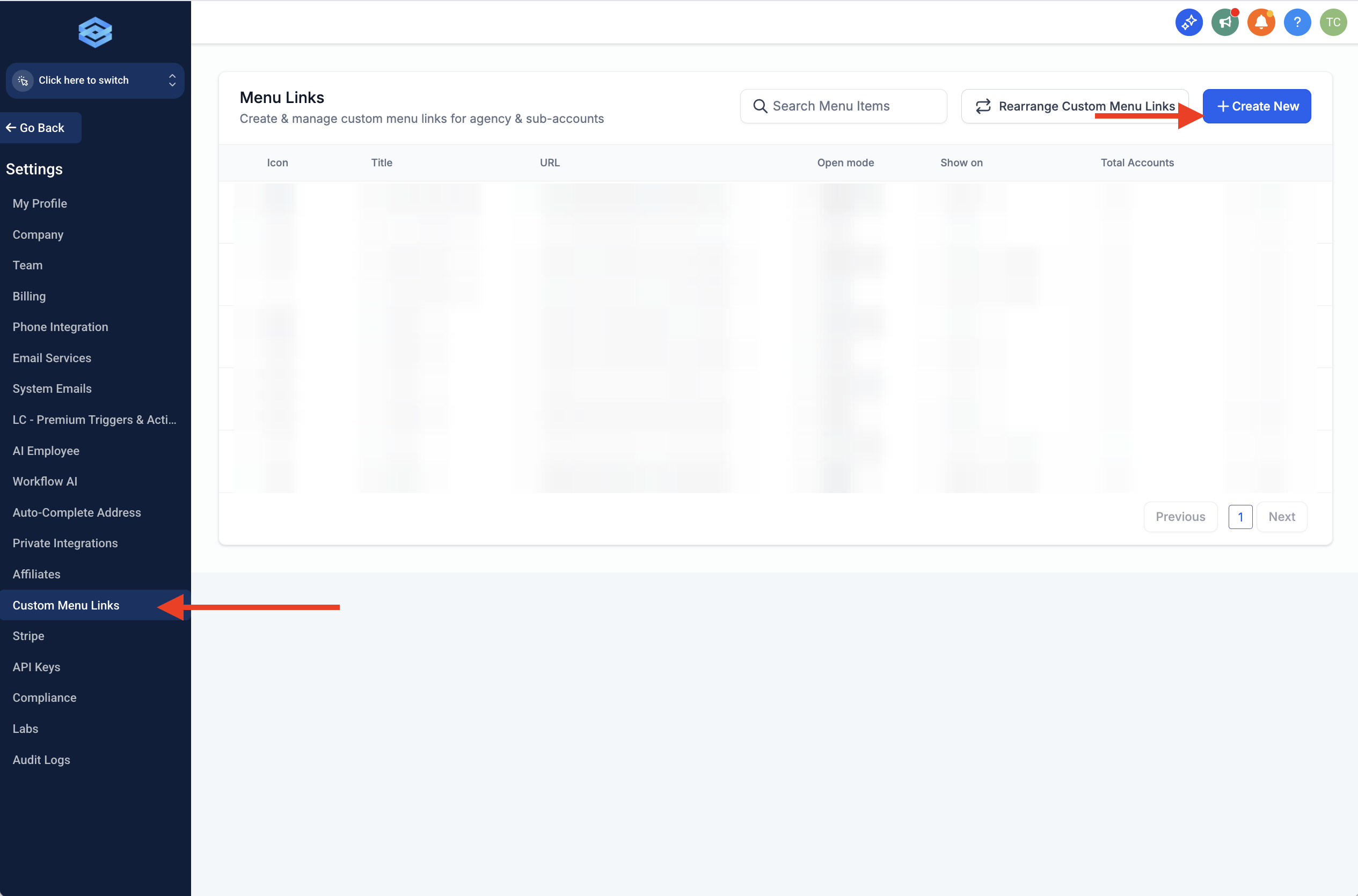 2.3 Inside your GHL Agency View > settings > “Custom Menu Links section” click + Create New